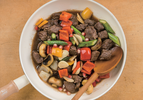 6 ━ 팬에 썰어둔 야채를 볶다가 구워둔 소고기와 소스를 부어 볶고 마지막에 석류알을 함께 넣어 완성한다.