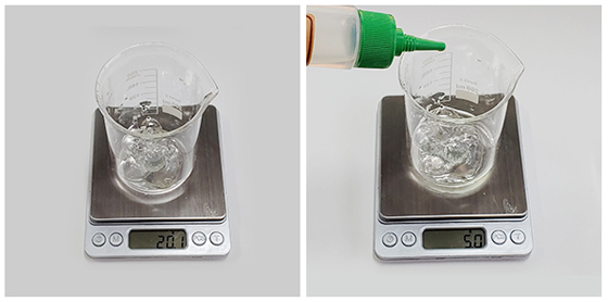 ➋ 두 번째 비커에 알로에베라겔 20g과 글리세린 5g을 첨가한 후 잘 저어준다. 알로에베라겔과 글리세린 모두 점도가 높기 때문에 잘 섞이도록 5분 이상 저어준다.