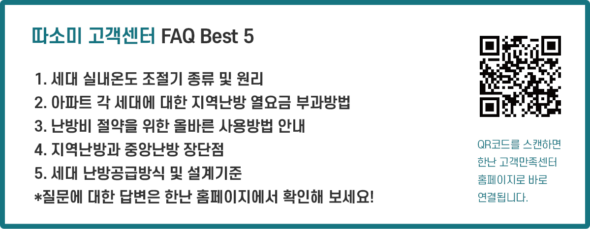 따소미 고객센터 따소미 고객센터 전화번호인 1688-2488. 한난은 현장에서 발생하는 다양한 문제점들을 전문 상담사를 통해 해결하고, 원활한 서비스를 제공할 수 있도록 고객상담센터인 ‘따소미 고객센터’를 운영하고 있다. 따소미 고객센터는 지역난방 사용자 시설에 대한 전문적인 지식과 정보를 제공하며, 체계적인 기술지원과 맞춤형 실습교육을 통해 고객시설 유지관리에 기여하고 있다.